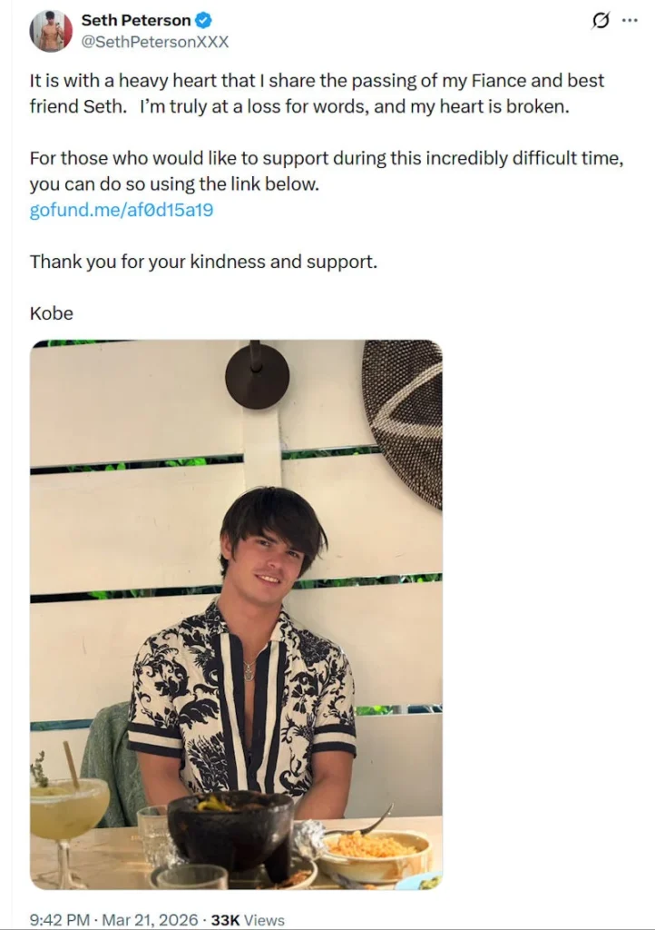 En su mensaje, Kobe escribió: “Con gran pesar, les comunico el fallecimiento de mi prometido y mejor amigo, Seth. Me faltan las palabras y tengo el corazón roto.” En la página de GoFundMe se indica que los fondos recaudados se destinarán a cubrir los gastos del funeral y se añade la nota: “Seth fue encontrado en nuestra casa hoy temprano. Era muy querido y lo extrañaremos profundamente.”